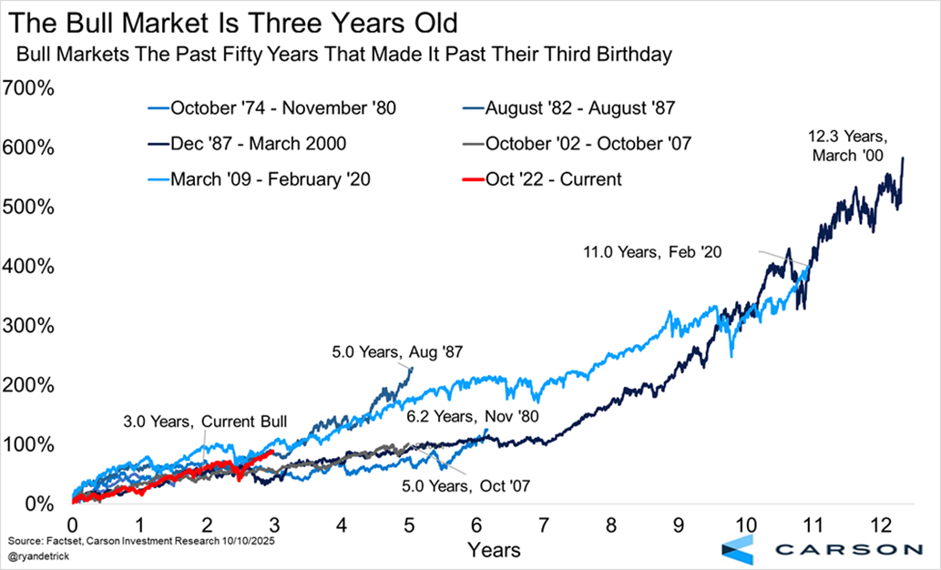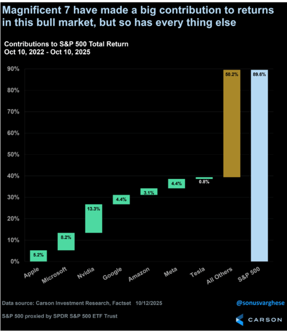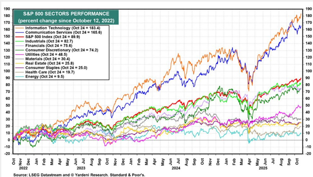 Býčí trh na Wall Street oslávil v októbri tretie výročie a vstúpil do svojho štvrtého roka. Za 36 mesiacov narástol index S&P 500 približne o 90 percent, pričom zhruba tri štvrtiny jeho nárastu vysvetľujú akcie ohľadne umelej inteligencie, ktorej boom spustilo uvedenie aplikácie ChatGPT v novembri 2022. Vďaka nemu si akcie Big Tech firiem združené v Magnificent 7, teda vo veľkolepej sedmičke, pripísali za toto obdobie takmer 300-percentný zisk, index polovodičov Philly Semiconductor narástol o vyše 220 percent. Len samotný výrobca čipov Nvidia zvýšil svoju trhovú kapitalizáciu v priebehu troch rokov o vyše 1 500 percent, čo predstavuje viac ako 4 bilióny dolárov, a stal sa najväčšou verejne obchodovanou firmou na svete s podielom na indexe S&P 500 na úrovni ôsmich percent.