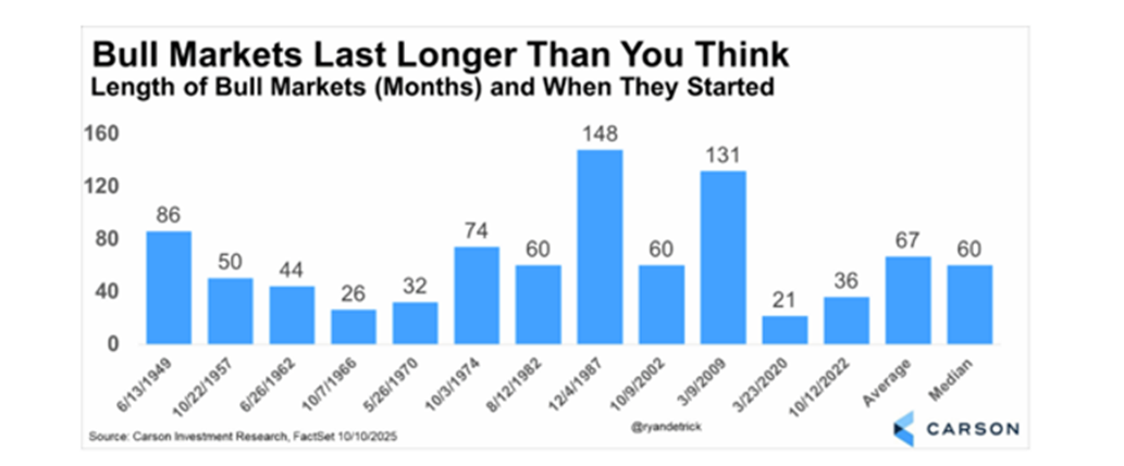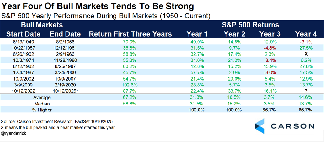 V modernej histórii amerických akciových trhov po 2. svetovej vojne mal býčí trh trvanie v priemere 67 mesiacov, teda niečo vyše päť a pol roka s priemernou návratnosťou mierne nad 190 percent. Pričom vo štvrtom roku doručoval v priemere zhodnotenie na úrovni 14,6 percenta. Hoci je každý býčí trh iný, nielen zo štatistického hľadiska je veľká šanca, že ten aktuálny sa ešte nemusí skončiť.