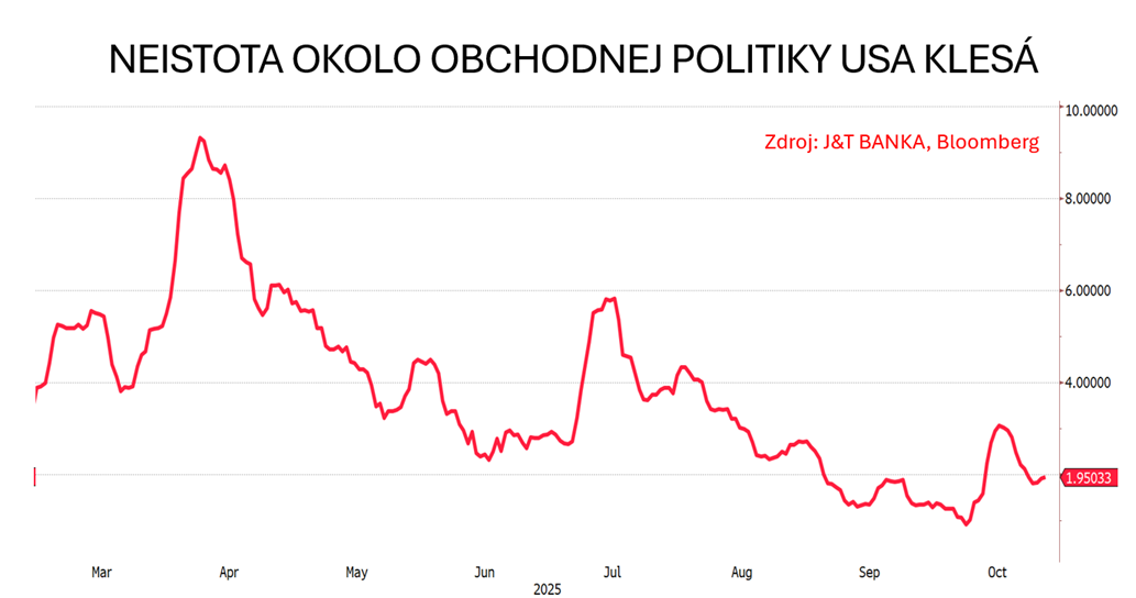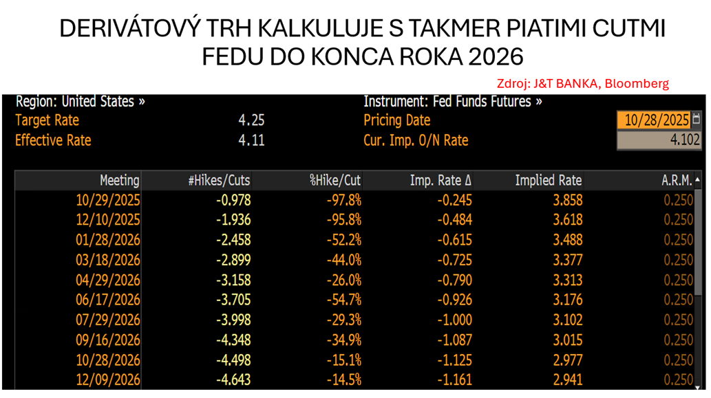 Inflačné tlaky sú síce v USA zvýšené a plný efekt vyšších colných sadzieb oproti začiatku roka sa stále neprejavil, čo možno predpokladať až v budúcom roku, no opačným smerom bude na cenový vývoj pôsobiť chladnutie trhu práce s dezinflačným efektom energií a nákladov na bývanie. To by malo vytvoriť Fedu priestor na ďalšie uvoľnenie menovej politiky (s cieľom podporiť ekonomiku a trh práce) zo súčasného mierne reštriktívneho módu. To by mohol byť určitý vietor do plachiet pre rely a čiastočne by to mohlo oprávňovať aj vyššie valuácie pri nižších trhových úrokových sadzbách.