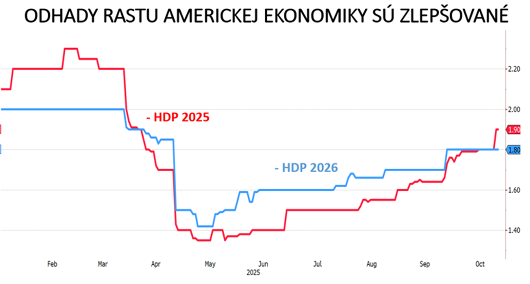 Americká ekonomika je v solídnej kondícii a perspektívy jej rastu sa oproti jari zlepšujú po tom, čo neistota okolo colnej vojny klesla, keď sa Biely dom dohodol na sérii obchodných dohôd s mnohými významnými partnermi vrátane EÚ či Japonska a zvyšku sveta už oznámil výšku ciel. V ostatnom čase sa objavujú aj správy, že by mohla byť podpísaná komplexná dohoda o novom nastavení obchodných vzťahov s Čínou, čo bude odstraňovať ďalší čriepok neistoty v medzinárodnom obchode. Tieto faktory by mali prevážiť nad protivetrami podstatne vyšších dovozných ciel oproti stavu z úvodu roka.