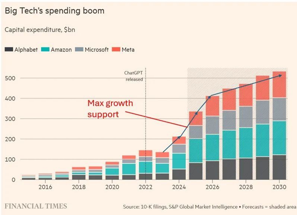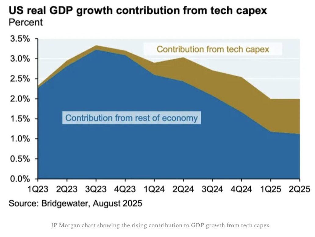 Americkému hospodárstvu výrazne pomáha boom okolo umelej inteligencie, kde sa kapitálové výdavky do jej infraštruktúry na čele s datacentrami, kde vládne ostrá konkurencia s cieľom nezaostať vo vývoji a mať čo najvyšší výpočtový výkon, stali už hlavným príspevkom k rastu HDP za prvý polrok 2025. V budúcich rokoch by mali ďalej dynamicky rásť.