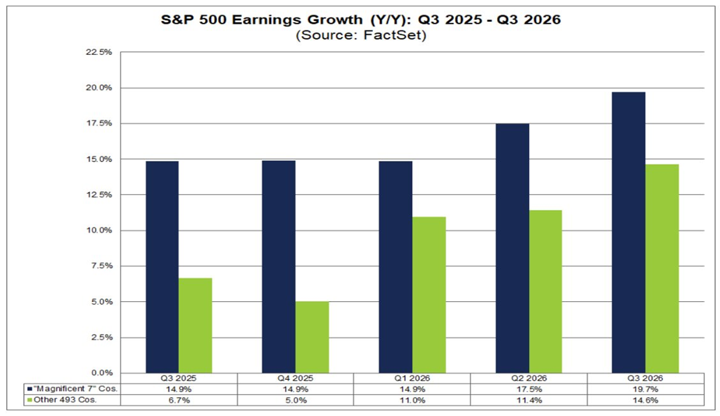 Graf 14: Projekcie rastu ziskov Magnificent 7 a zvyšku indexu S&P 500