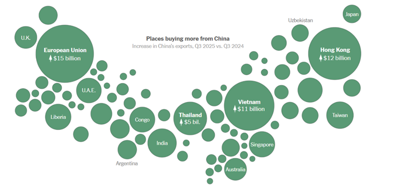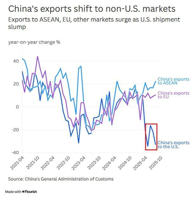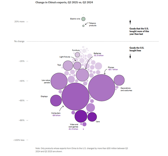 Čínske exporty sa presúvajú z USA do Ázie. Od začiatku roka klesol vývoz do USA približne o 75 miliárd dolárov. Pri čínskom priemyselnom tovare exportovanom do USA klesá najmä export počítačov, telefónov hier, nábytku a „low-value parcels“, teda kategórií, na ktoré sú cielené americké dovozné clá a prísnejšia kontrola pôvodu.