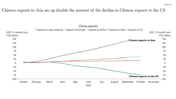 Výsledkom je prepis dodávateľských reťazcov, čoho dôsledkom je, že viac objemov čínskeho exportu tečie cez ázijské koridory, kde rastú investície do kapacít. Ázia absorbuje nielen to, čo pri obchode s USA stratili, ale omnoho viac.