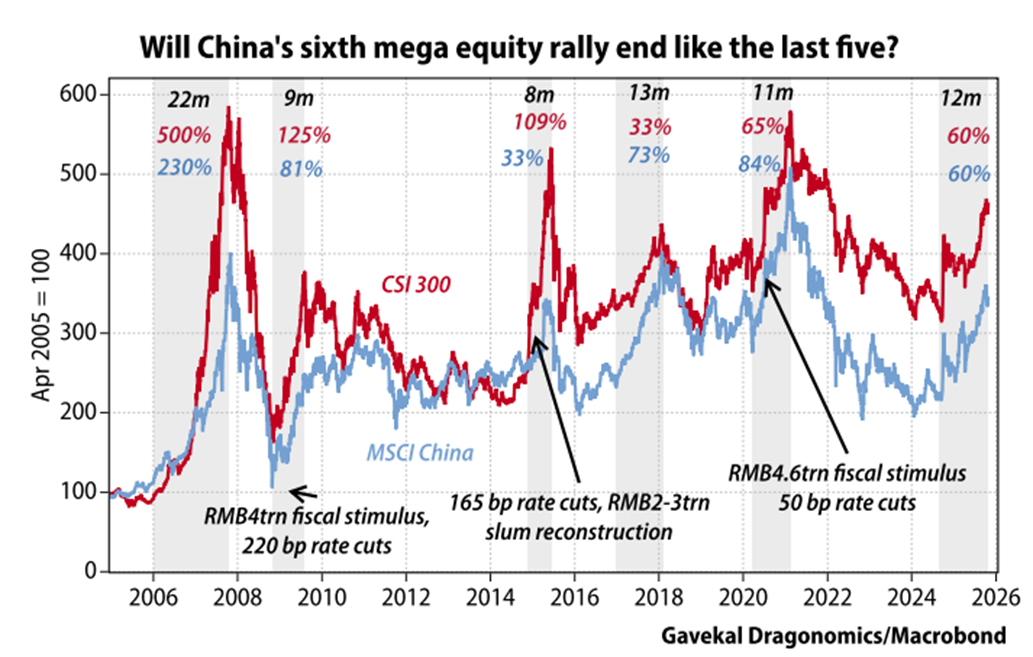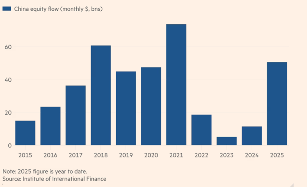 Ak skombinujeme burzy v Hongkongu, Šanghaji a Šen-čene, podľa trhovej kapitalizácie pôjde, hoci s veľkým odstupom, o druhý najväčší akciový trh na svete hneď za Wall Street. Preto by mal byť prirodzenou voľbou pre zahraničných investorov s cieľom diverzifikácie od bohato oceneného amerického trhu na čele s Big Tech firmami. Napriek tomu sa donedávna z viacerých dôvodov, od geopolitického napätia a obáv z obchodnej vojny cez nevyberavé regulačné zákroky voči firmám až po nekonzistenciu v zhodnotení, vyhýbali Číne. To sa však začína meniť, keď prítok zahraničného kapitálu na čínsky trh dosiahol za prvých desať mesiacov tohto roku viac ako 50 miliárd dolárov, čo je päťnásobok celého roka 2024.