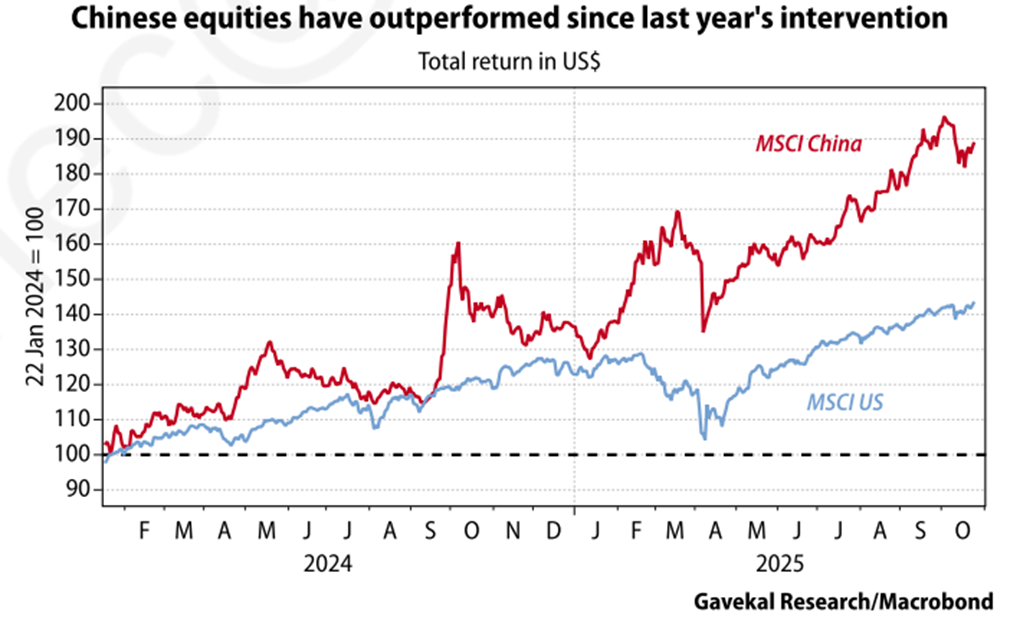 Motivuje ich k tomu atraktívne zhodnotenie čínskeho akciového trhu v ostatnom čase, po predchádzajúcich chudobných rokoch. Od januára 2024 po zavedení viac intervenčnej čínskej hospodárskej politiky cielenej aj na stabilizáciu akciového trhu Čína prekonáva Wall Street, ak porovnáme celkovú návratnosť indexov MSCI China a MSCI US.