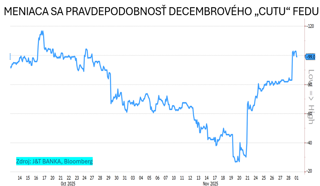 Časť centrálnych bankárov preferovala prestávku, kým sa makrosituácia viac vyjasní pri hmle shutdownu s absenciou zverejňovania makrodát na čele s trhom práce. Od konca októbra preto systematicky klesali očakávania, že Fed v decembri opäť uvoľní menovú politiku, trh skôr predpokladal, že sa tak stane až začiatkom roka 2026. Jednoducho medzi tvorcami menovej politiky nastala veľká schizma, čo následne potvrdilo aj zverejnenie zápisnice z októbrového zasadnutia FOMCI v druhej polovici novembra. Pritom sa viacerí z nich prezentovali skôr jastrabím slovníkom. Preto okolo 20. novembra spadla pravdepodobnosť „cutu“ v decembri pod 30 percent. Prispelo k tomu aj oznámenie, že novembrový nonfarm payrolls report z trhu práce bude zverejnený až po termíne decembrovému zasadnutia Fedu.