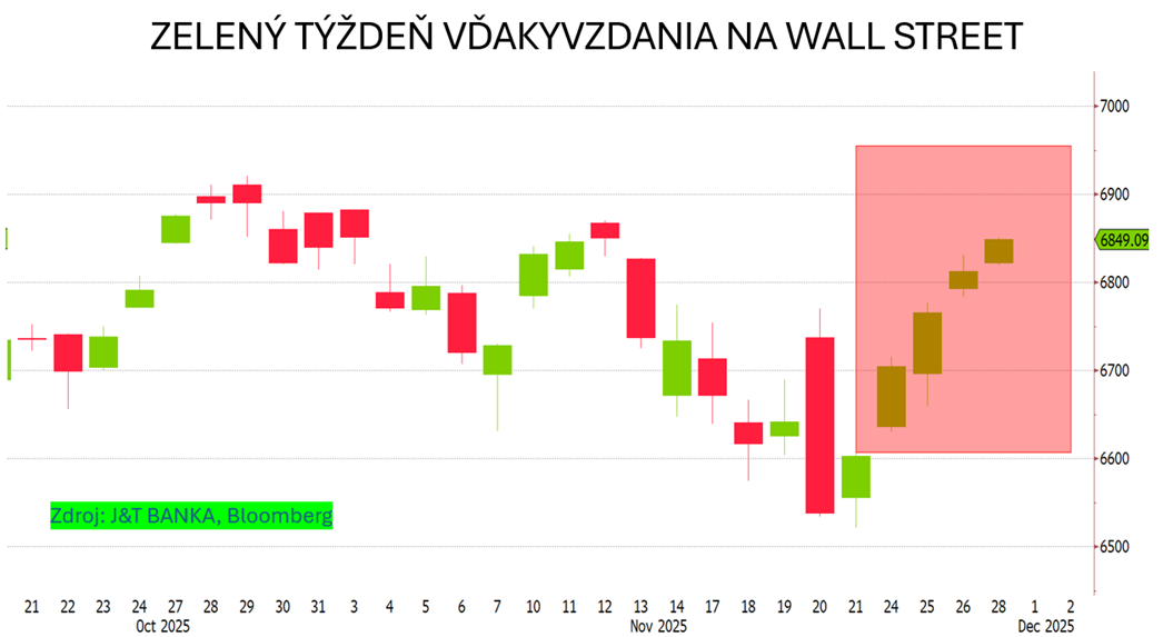 To výrazne prospelo Wall Street, ktorá sa odrazila z viac ako päťpercentného pullbacku z októbrových maxím na čele s technologickými titulmi okolo umelej inteligencie. Index S&P 500 vďaka tomu dosiahol najlepší „týždeň vďakyvzdania“ od čias pádu Lehman Brothers, keď si v ňom zaknihoval zisky každý deň.