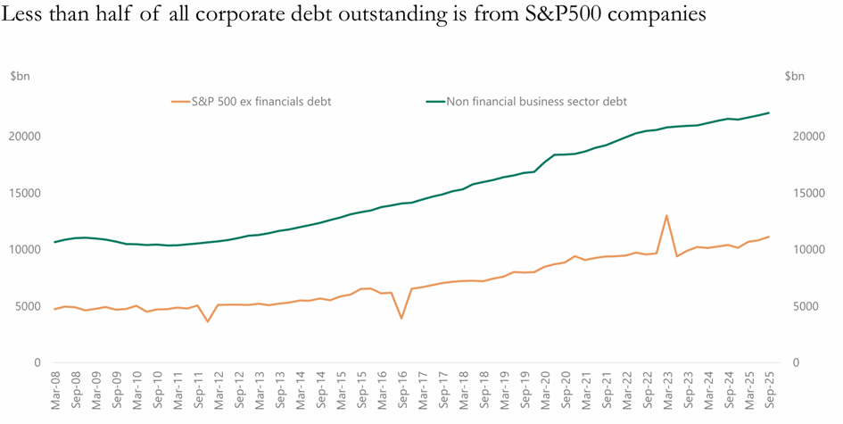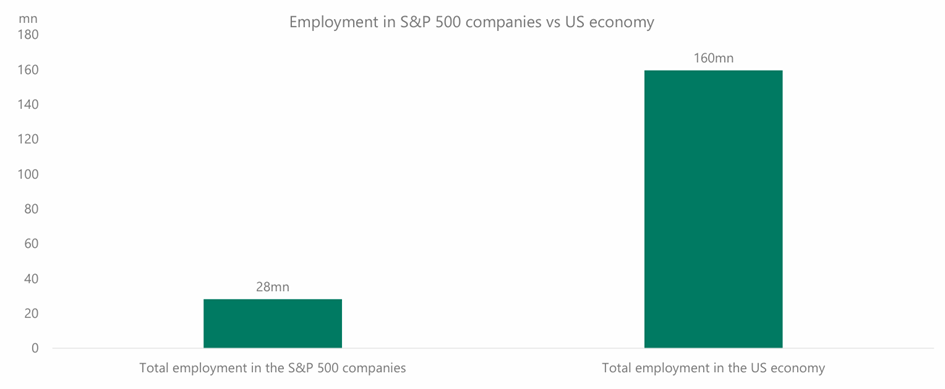 Väčšina pracovných miest vzniká v menších a stredných firmách, spravidla mimo burzy. Firmy z indexu S&P 500 zamestnávajú približne 28 miliónov ľudí, čo je asi 18 percent americkej pracovnej sily. Zvyšok tvoria menšie firmy a podniky mimo verejných trhov. Podobne je to s investíciami a s dlhom, kde menej než polovica podnikového dlhu sedí vo firmách z indexu S&P 500 a ich investície (capex) tvoria len približne pätinu celkových súkromných investícií v Spojených štátoch.