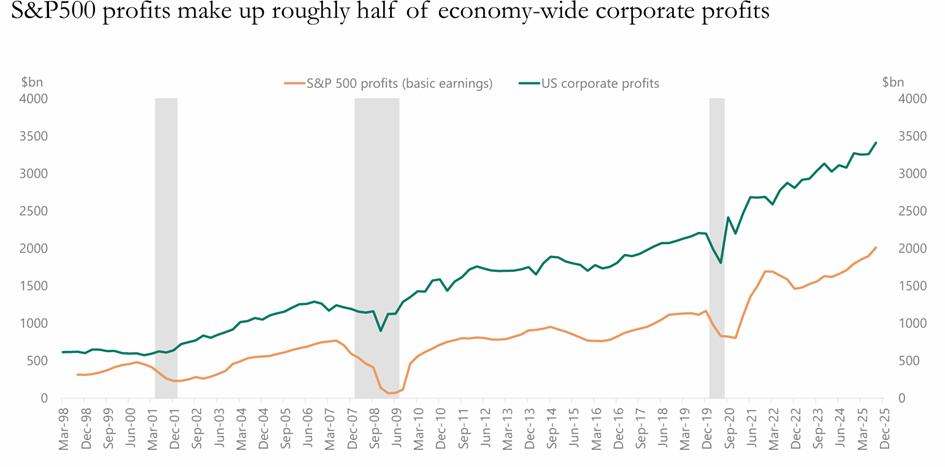 Index S&P 500 je barometer veľkých verejne obchodovaných spoločností. Tie majú obrovskú trhovú hodnotu a dominujú investorom aj titulkom. No z hľadiska reálnej ekonomiky, t. j. zamestnanosti, investícií a úverov, tieto spoločnosti predstavujú len časť obrazu.