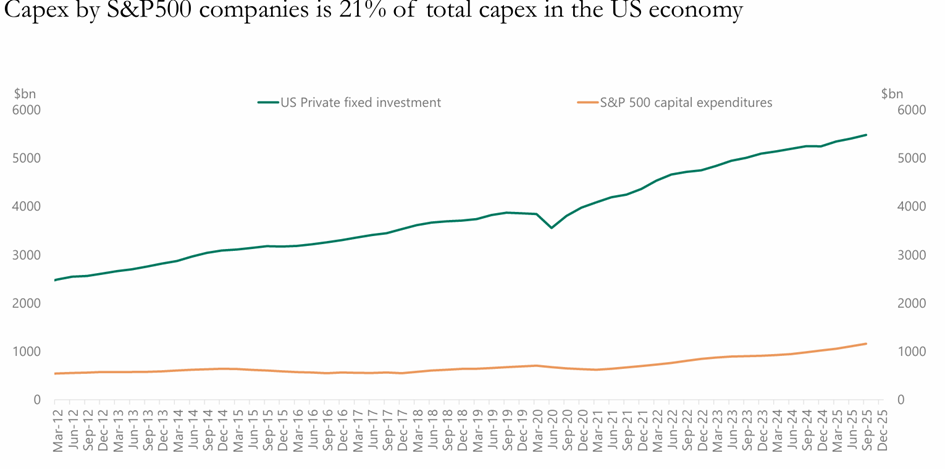 Graf 5: Capex firiem S&P 500 vs. celkové súkromné fixné investície (v miliardách dolárov)