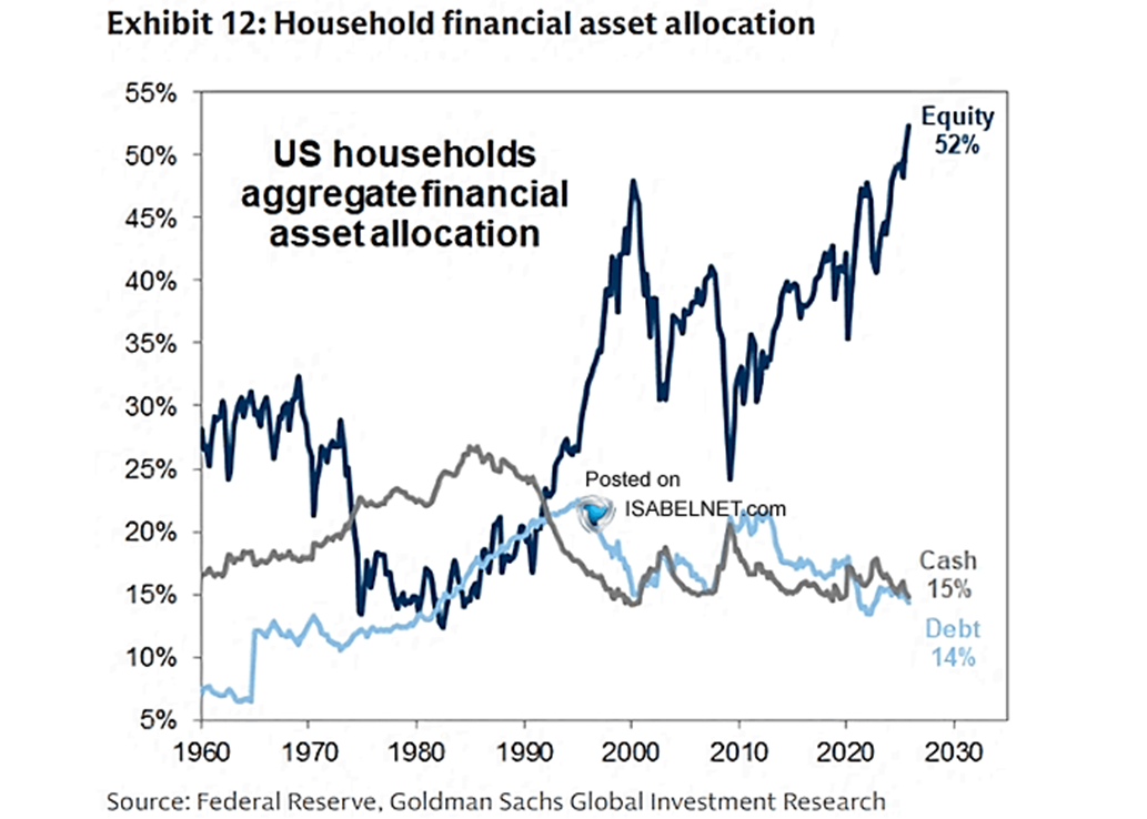 Americké domácnosti majú aktuálne až 52 percent svojich finančných aktív v akciách, čo je historické maximum. Ide o výrazne vyššie percentuálne zastúpenie v porovnaní s ostatnými domácnosťami z vyspelých krajín, čo poukazuje na výraznú expozíciu voči trhovému riziku. Zatiaľ čo podiel hotovosti a dlhu, ktoré sa javia ako relatívne neatraktívne pri zvýšených inflačných tlakoch, zostáva na nízkych úrovniach, prevažujúci podiel akcií zvyšuje citlivosť domácností na pokles cien akcií.