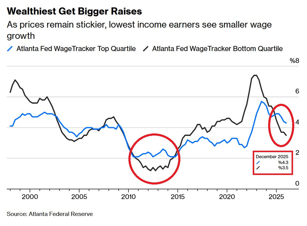 Podiel outputu amerického hospodárstva, ktorý smeruje k zamestnancom vo forme platov a ďalších kompenzácií za prácu, klesol podľa najnovších dát Bureau of Labor Statistics za tretí kvartál 2025 na 53,8 percenta, čo je najnižšia úroveň v histórii meraní od roku 1947. Od začiatku milénia klesol o viac ako 10 percentuálnych bodov. Ukazovateľ začal strmo klesať najmä od vrcholu pandémie koronavírusu. V tom istom období zaznamenali spoločnosti historicky vysoké ziskové marže, čo zvýšilo obavy z ďalšieho rastu nerovnosti v americkej ekonomike, ktorá je už dnes podľa mnohých ukazovateľov najvyššia v rámci vyspelých krajín OECD. Už niekoľko dekád sa pritom príjmové aj majetkové nerovnosti v Spojených štátoch zvyšujú.