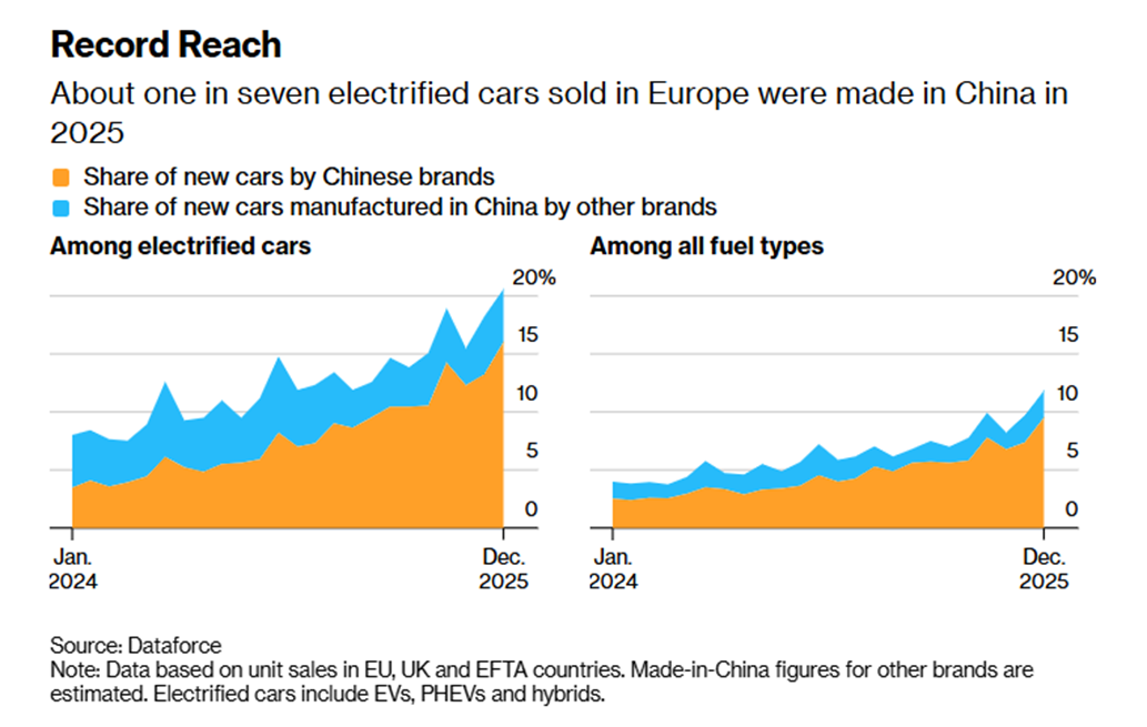 Za celý rok 2025 dosiahol agregovaný podiel čínskych značiek (najmä BYD, SAIC/MG, Chery/Omoda/Jaecoo či Leapmotor) 6,1 percenta, čo predstavuje medziročné zdvojnásobenie. Ešte lepšie sa čínskym výrobcom darí na trhu s elektromobilmi, kde v decembri dosiahli 16-percentný podiel a za celý minulý rok podľa dát Bloombergu im patrí 11 percent „z koláča“, čo predstavuje takisto viac ako zdvojnásobenie podielu oproti roku 2024.
