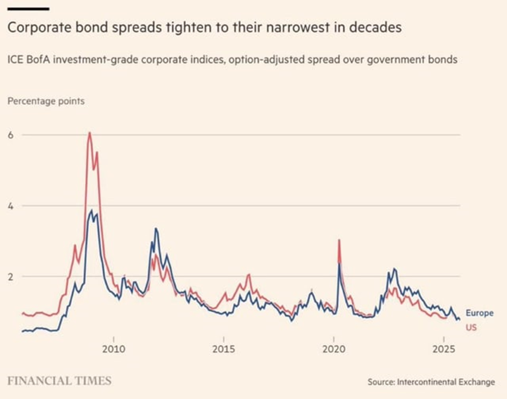 Rizikové prirážky podnikových dlhopisov v investičnom pásme podľa dát agentúry Bloomberg sa u amerických dolárových emitentov pohybujú okolo 70 bázických bodov, čo je najnižšia úroveň od konca 90. rokov minulého storočia. Kreditné spready emitentov v eurozóne v investičnom pásme sú len o málo vyššie, rádovo tesne pod 0,8 percenta, čo sú najnižšie úrovne za ostatných osem rokov. Agregátny ukazovateľ rizikovej prirážky korporátnych bondov naprieč menami, regiónmi a ratingami len mierne presahuje 100 bodov, čo je najnižšia prémia od roku 2007.