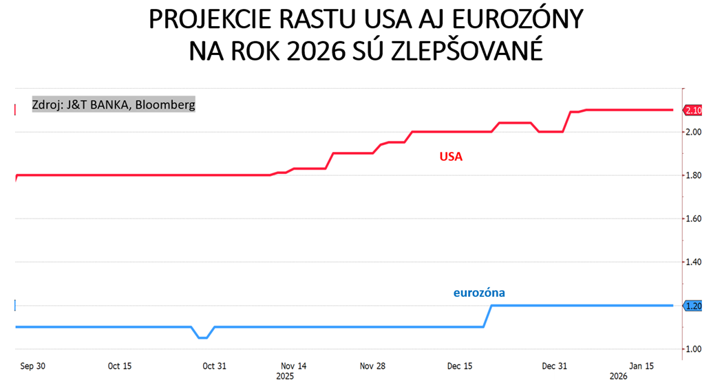 Aj preto predpokladáme, že americká ekonomika by mala rásť v tomto roku zhruba rovnakým tempom ako v predchádzajúcom a najnovší konsenzus rastu sa posunul dokonca nad dvojpercentnú métu. Mala by benefitovať z odolnej spotreby domácností podporenej zdravými bilanciami a pozitívnym efektom bohatstva po trojročnom býčom trhu na akciových trhoch a rastom biznis investícií najmä okolo umelej inteligencie s budovaním datacentier. Okrem toho bude dopovaná triumvirátom uvoľňovania menovej politiky, fiškálnou expanziou a dereguláciou podnikateľského prostredia v rámci prijatého tzv. veľkého krásneho zákona. Eurozóna síce nominálne prechodne spomalí dynamiku rastu oproti roku 2025, ale sentiment okolo nej je optimistický a ďalej sa zlepšuje. Nemecko, najväčšia európska ekonomika, by sa malo vymaniť z trojročnej stagnácie pre oznámený veľký fiškálny impulz s rastom verejných investícií do infraštruktúry, ktorá je objektívne zastaralá, a do obrany, čo sa plne odrazí až na prelome rokov 2026 a 2027. Okrem toho v menovej únii ostáva stabilná spotreba domácností a zlepšiť by sa mali investície a exporty pre menej reštriktívnu menovú politiku, fiškálne uvoľňovanie, ako aj menej protivetrov v medzinárodnom obchode.
