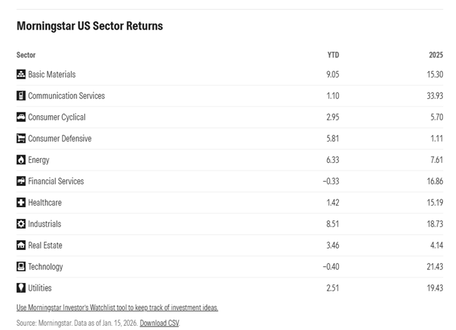 Graf 3: Výnosy amerických sektorov podľa Morningstar (od začiatku roka 2026)
