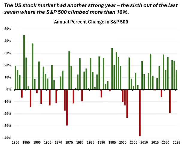 Graf 7: S&P 500 - Ročná percentuálna zmena (1950 – 2025)