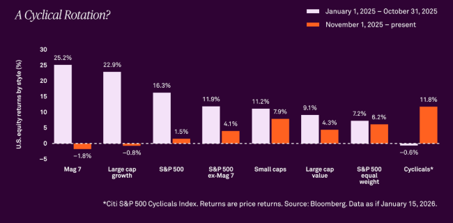 Tento obrat sa odráža aj vo výkonnosti jednotlivých segmentov za obdobie od 1. 11. 2025 až po súčasnosť, kde kôš cyklických sektorov je v pluse 11,8 percenta, small caps si pripisujú 7,9 percenta, index S&P 500 rastie o 6,2 percenta a S&P 500 bez Magnificent 7 (bez 7 najväčších technologických spoločností) o 4,1 percenta. Na opačnom konci spektra sú Magnificent 7 so stratou 1,8 percenta a large-cap akcie s poklesom o 0,8 percenta. Ešte donedávna pritom platil presný opak (Magnificent 7 rástli tempom približne 25 percent ročne), čo predstavuje prvý jasný signál, že trh sa prestáva opierať o úzky klub technologických gigantov a postupne presúva váhu smerom k cyklicky citlivejším segmentom.