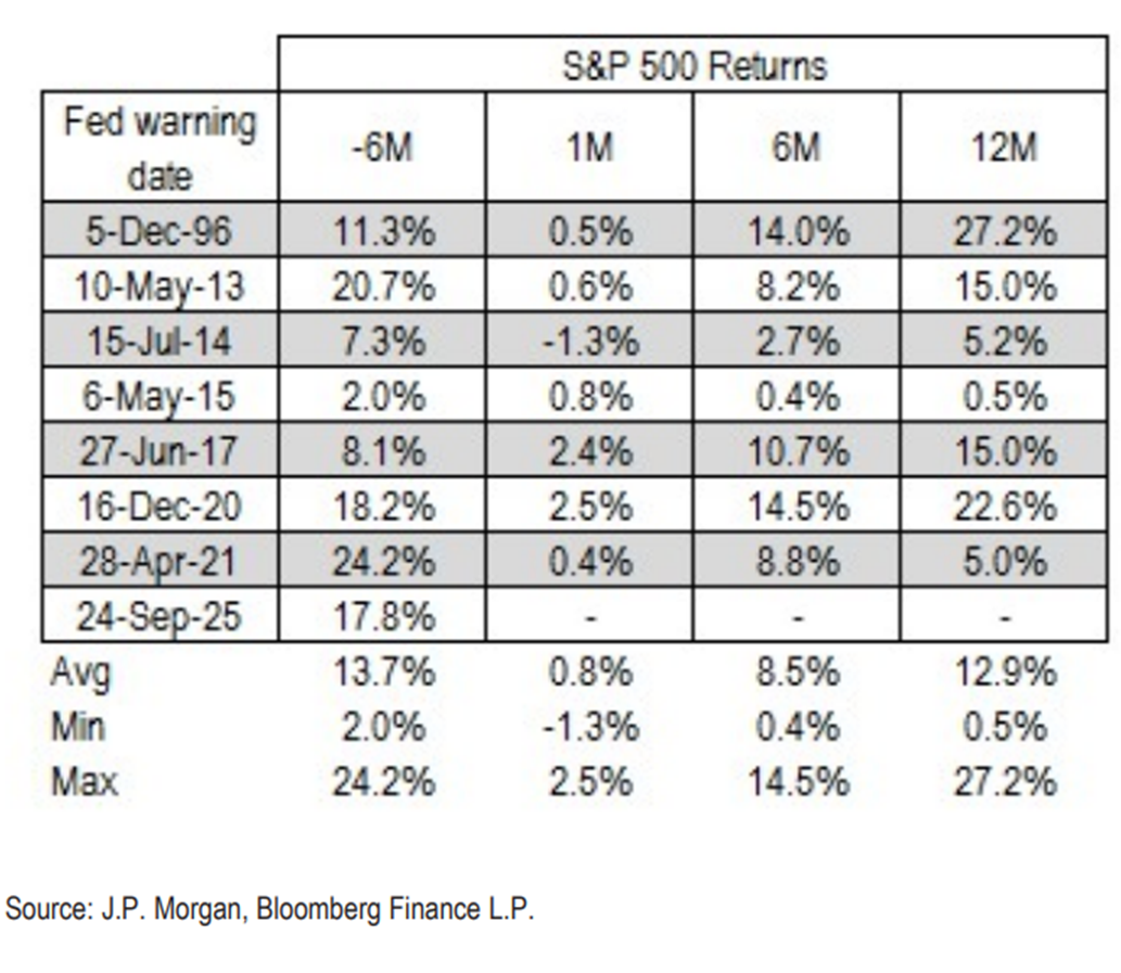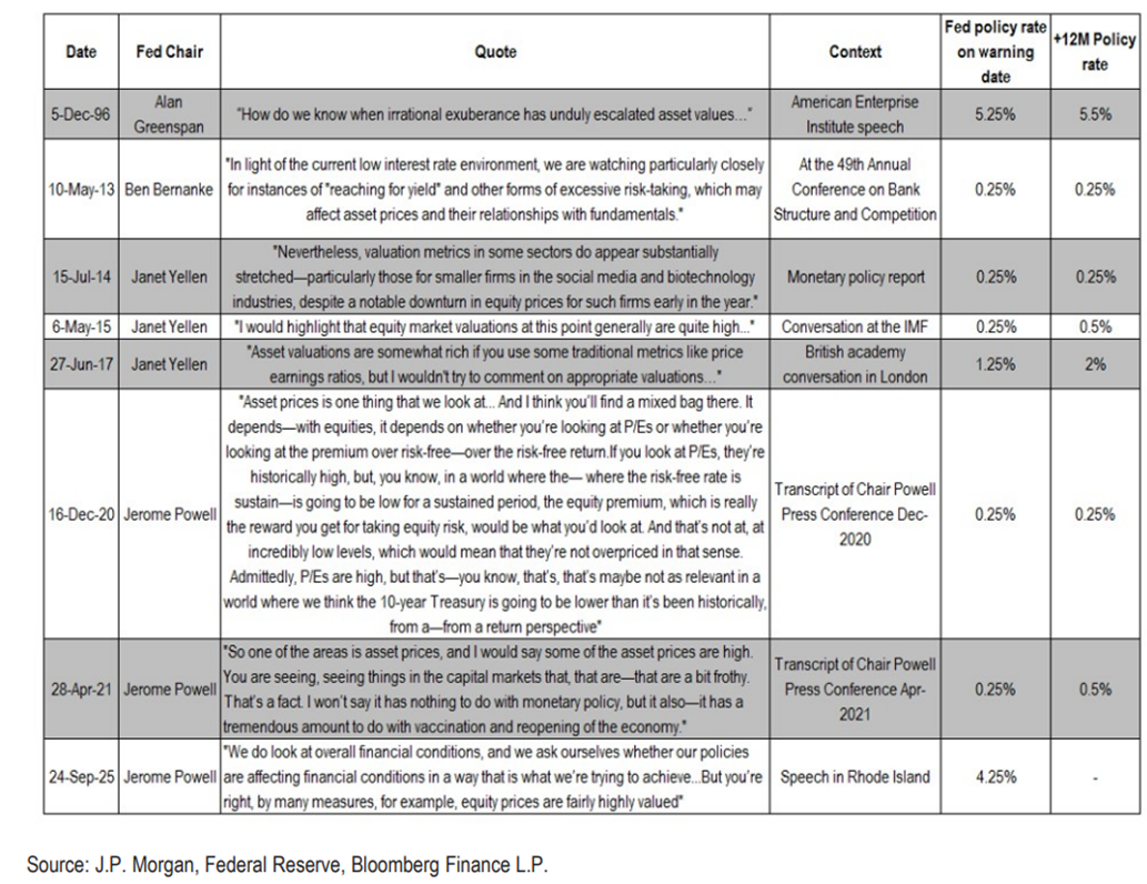 V nedávnej histórii, najmä po periódach silného rastu rizikových aktív po veľkej finančnej kríze z prelomu rokov 2008 a 2009, vydávali viacerí šéfovia Fedu, americkej centrálnej banky, varovné signály ohľadne štedrých valuácií trhu a samouspokojenia trhových hráčov nad týmto stavom.