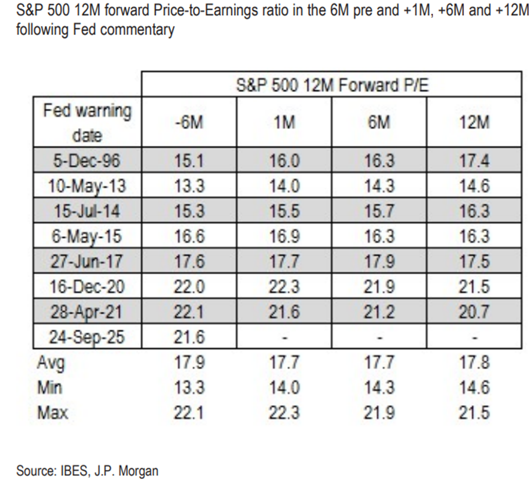 V priemere index S&P 500 narástol o 8,5 percenta za pol roka po výstrahách šéfov Fedu a o takmer 13 percent v 12-mesačnom horizonte. Pri pohľade do spätného zrkadla však išlo o mierne spomalenie výkonnosti, ktorá sa šesť mesiacov pred výrokmi pohybovala v priemere na úrovni 13,7 percenta. Z valuačného hľadiska na báze budúcoročných ziskov k cenám, teda forward P/E pomeru ostal v šesťmesačnom aj dvanásťmesačnom horizonte a index S&P 500 takmer bez zmeny, teda na nadpriemerných valuáciách takmer 18-násobku forwardového P/E.