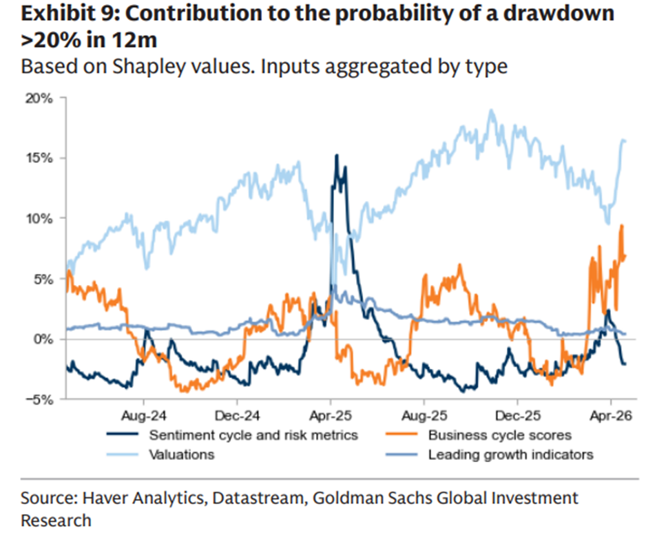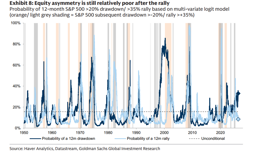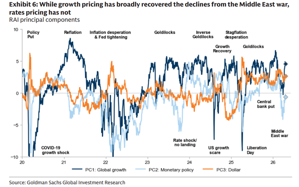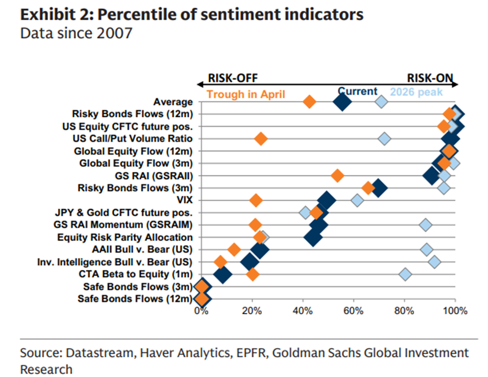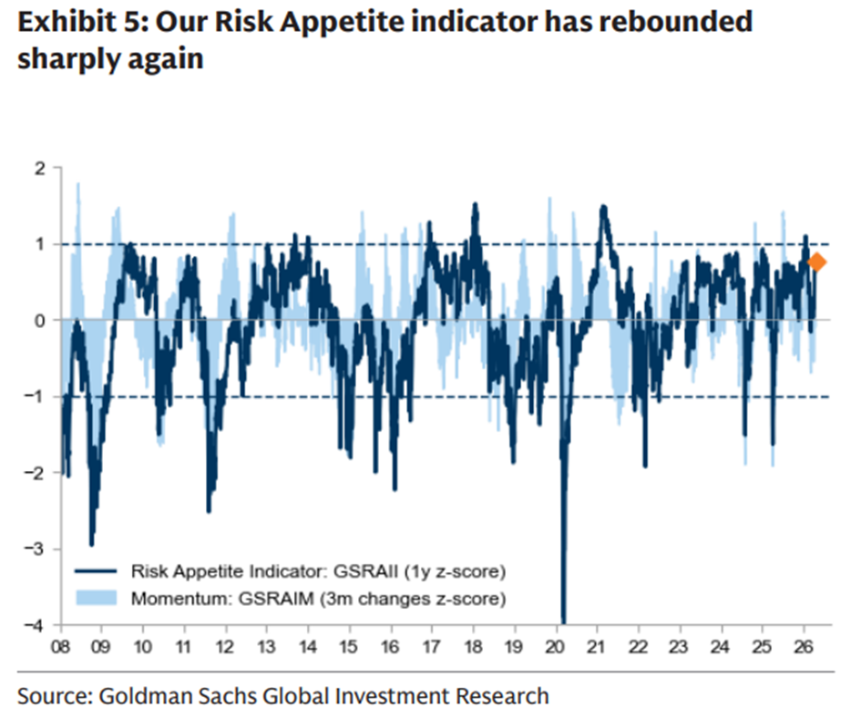 Celková miera optimizmu však stále nedosahuje zvýšené úrovne ako na začiatku roka, ktoré čerpali energiu zo zlatovlasých očakávaní okolo rozmachu umelej inteligencie. Za prudkou otočkou ochoty podstupovať riziko po Veľkej noci bol podľa Goldman Sachs v prvom rade obrat pozícií na opčnom trhu a re-risking od systematických stratégií ako risk parita či trend nasledujúce CTA investície a zatváranie krátkych makropozícií, keď sa americká ekonomika ukazuje ako odolná, pričom zverejňované prieskumy nateraz prekonávali očakávania. Hedžové fondy v úvodných fázach konfliktu redukovali riziko aj leverage, teda páku, no aktuálne nastáva aj v tomto segmente obrat, hoci relatívne opatrný, čo dáva priestor na pritlačenie na dodatočné podstupovanie rizika. Agregátny ukazovateľ risk appetite indicator (RAI) Goldman Sachs sa však už blíži k úrovni jedného bodu, čo sú úrovne z januára (keď sa nachádzal dokonca nad touto hranicou), a indikoval silné makroprostredie. Priestor na ďalšie zlepšenie už nemusí byť veľký pri stálom započítavaní vyšších úrokových sadzieb pre vyššie ceny energií a vyššie úrovne inflácie.